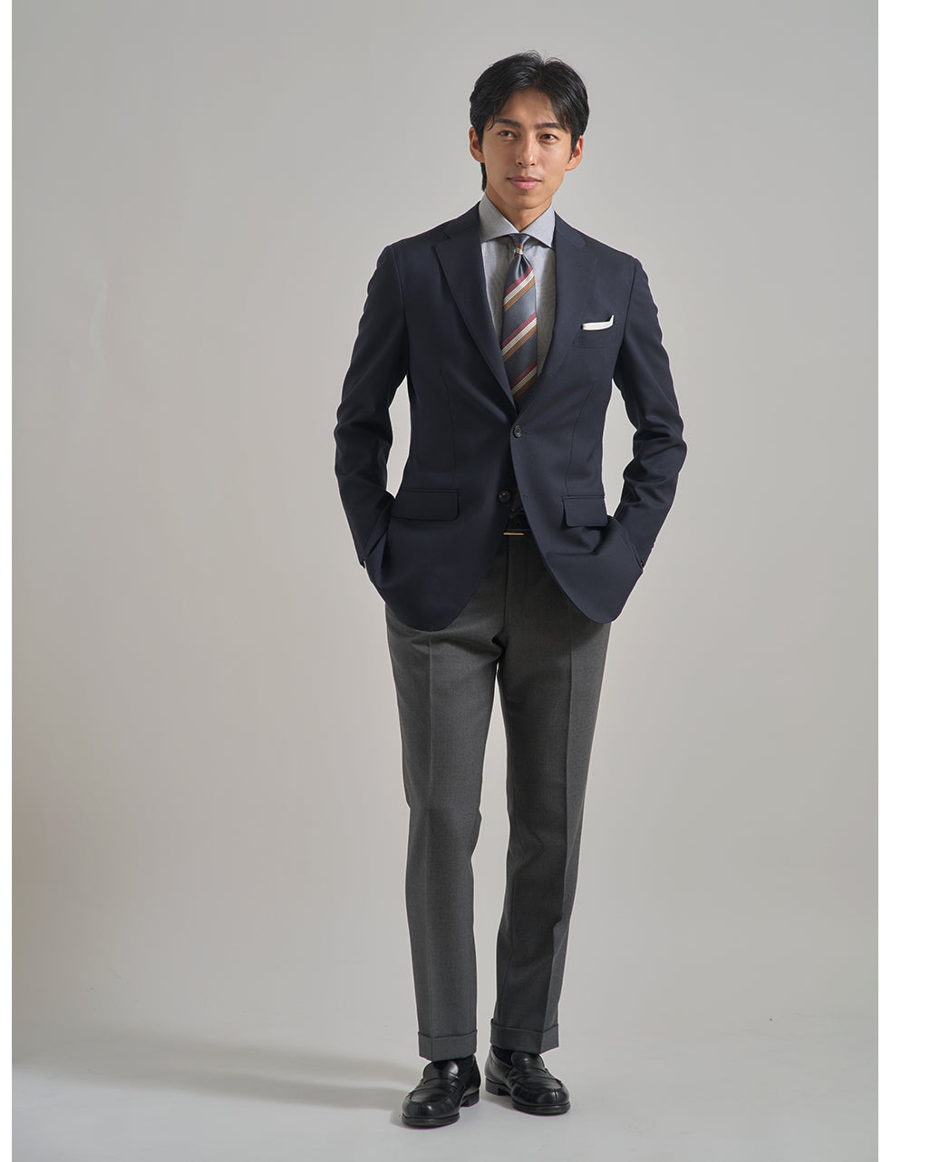 Man in a suit standing confidently in a modern interior space.