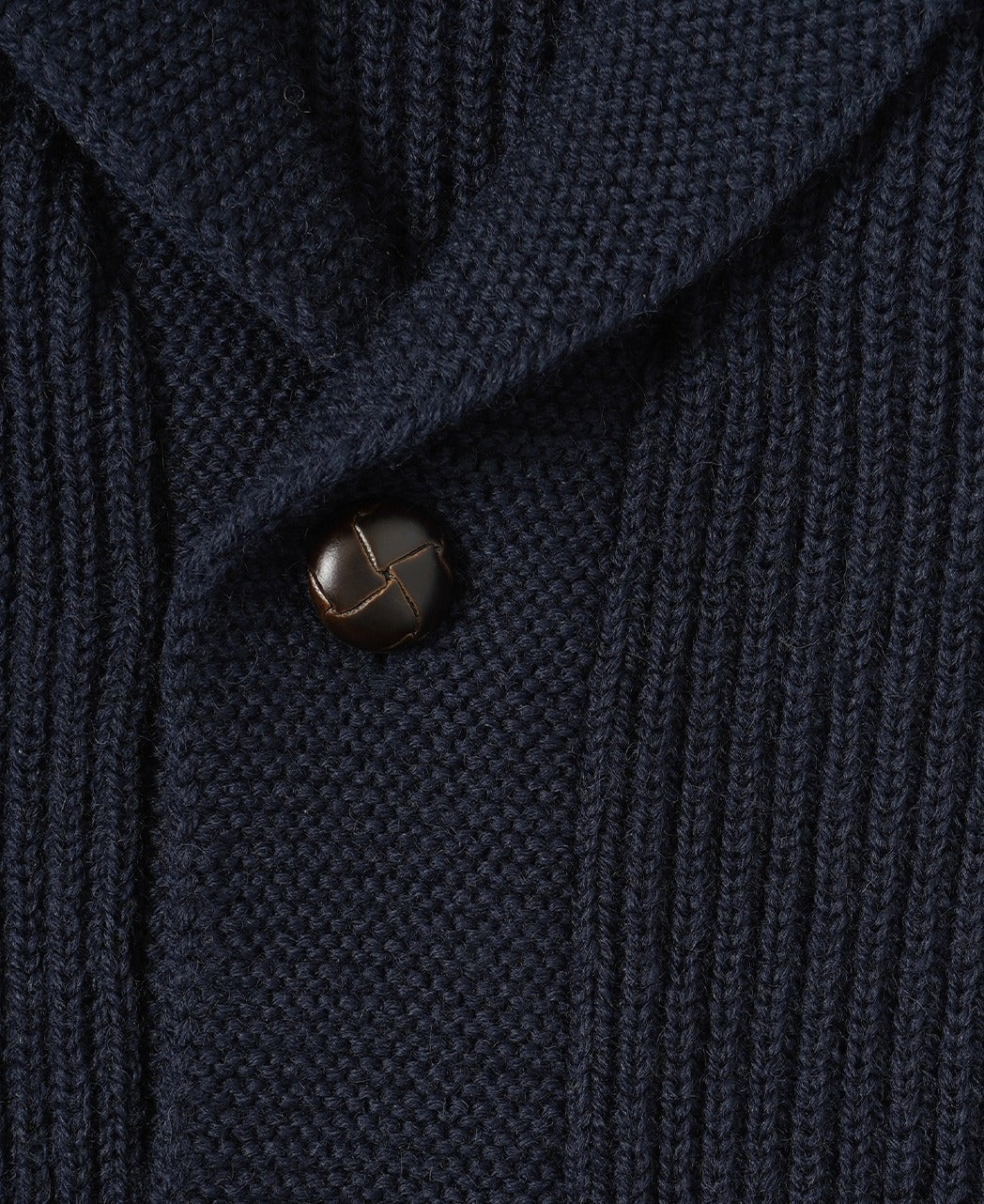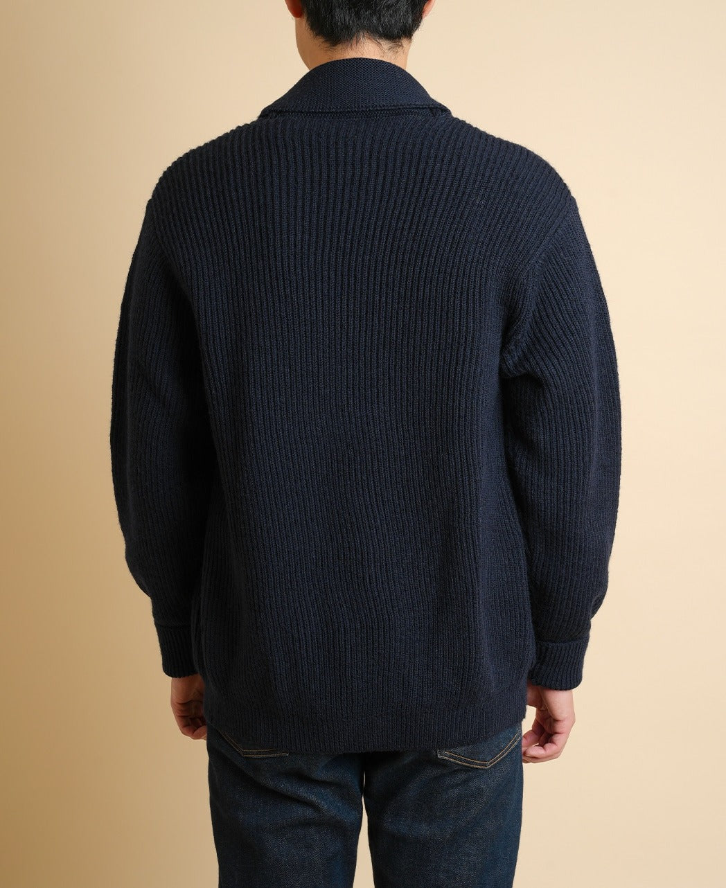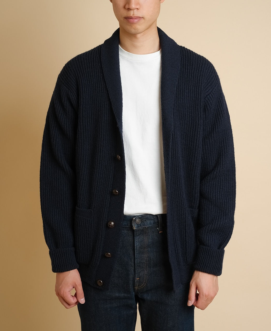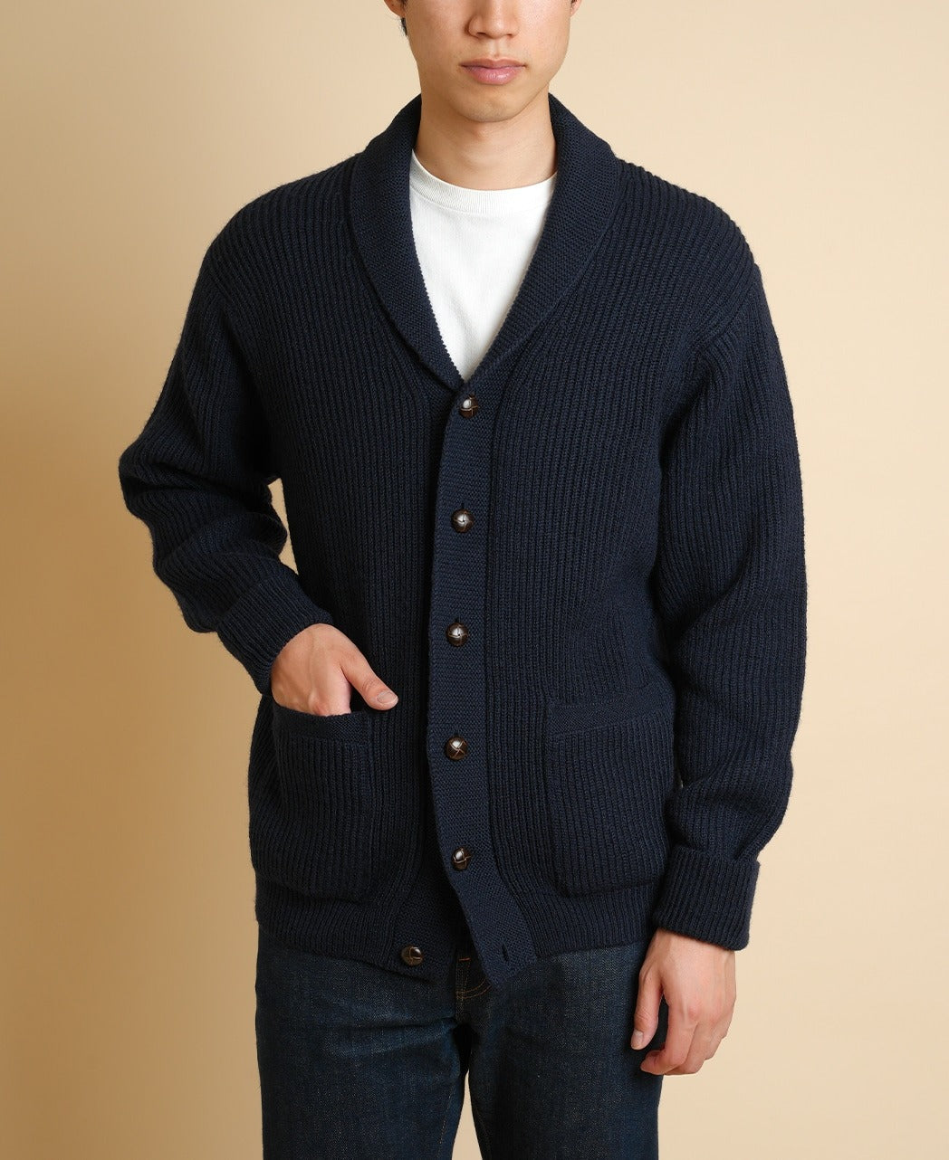 We've faithfully reproduced the shawl collar cardigan that Steve McQueen, who still has a huge following today, often wore in the 1960s. Knit from a tough British wool, it features a rib-knit body and a garter-stitched collar and front. It pairs perfectly with our vintage Ivy shirts, of course, and also creates a ruggedly handsome look when worn over a T-shirt.