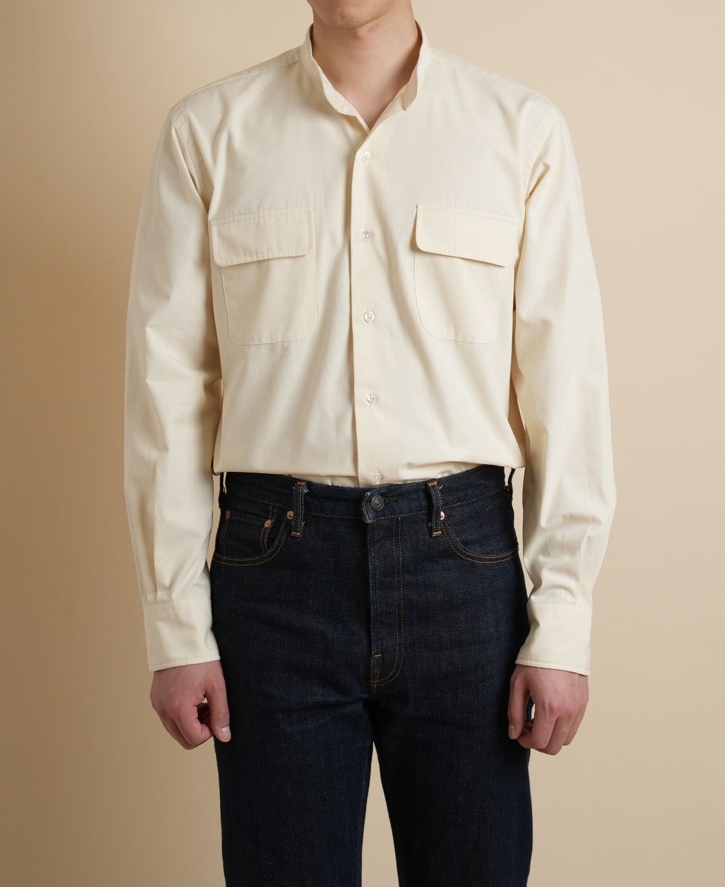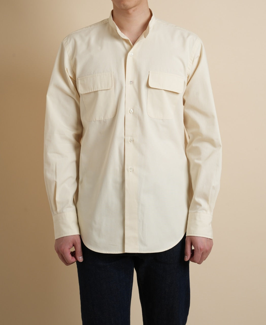 Vintage Ivy Band Collar Famously worn by Miles Davis on the album cover of Miles Davis at Newport 1958, our band-collar shirt works as a standalone piece but also looks great under a summer jacket. French placket front, and flaps on both front pockets.