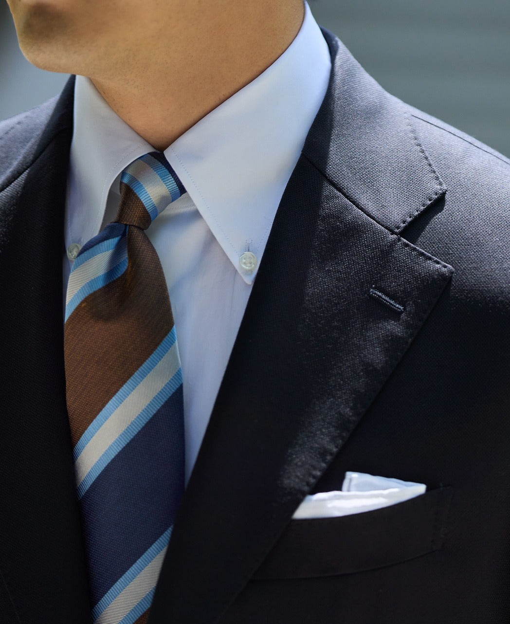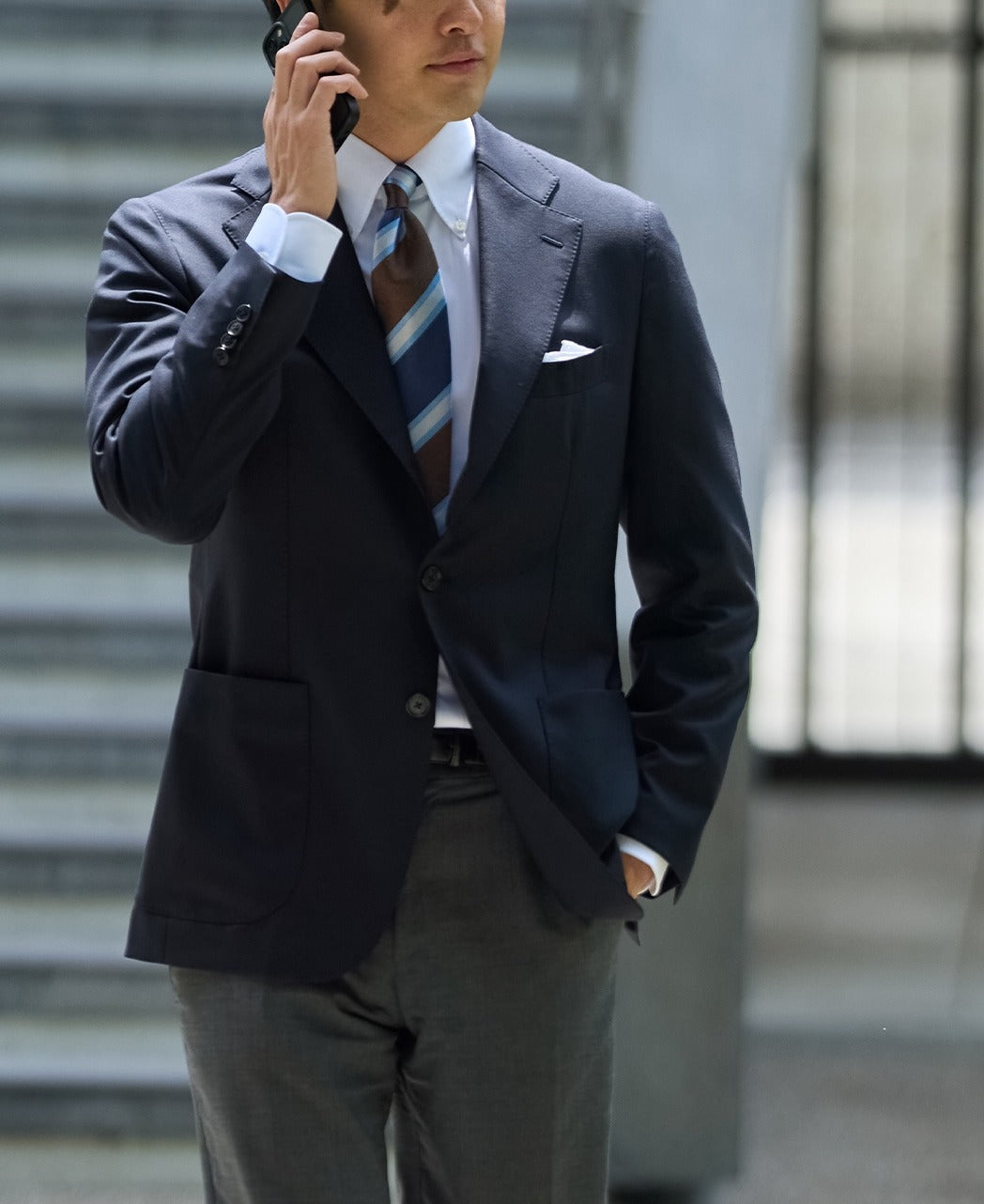 A classic navy jacket co-developed with Miyuki Keori, a renowned woolen fabric manufacturer with over a century of history. This piece features the beautiful sheen and refined texture unique to Royal Oxford fabric.