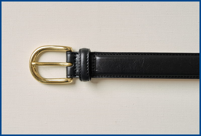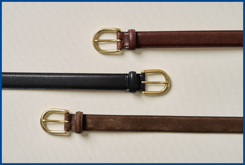 When it comes to high-waisted traditional trousers, we find a slim belt with a classic gold horseshoe buckle to be the ideal pairing.