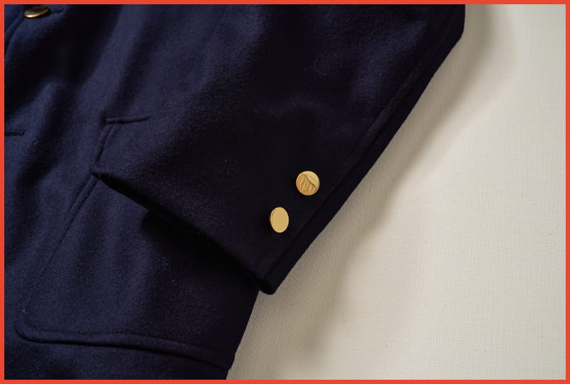 spaced six-front buttons are made from white mother-of-pearl.