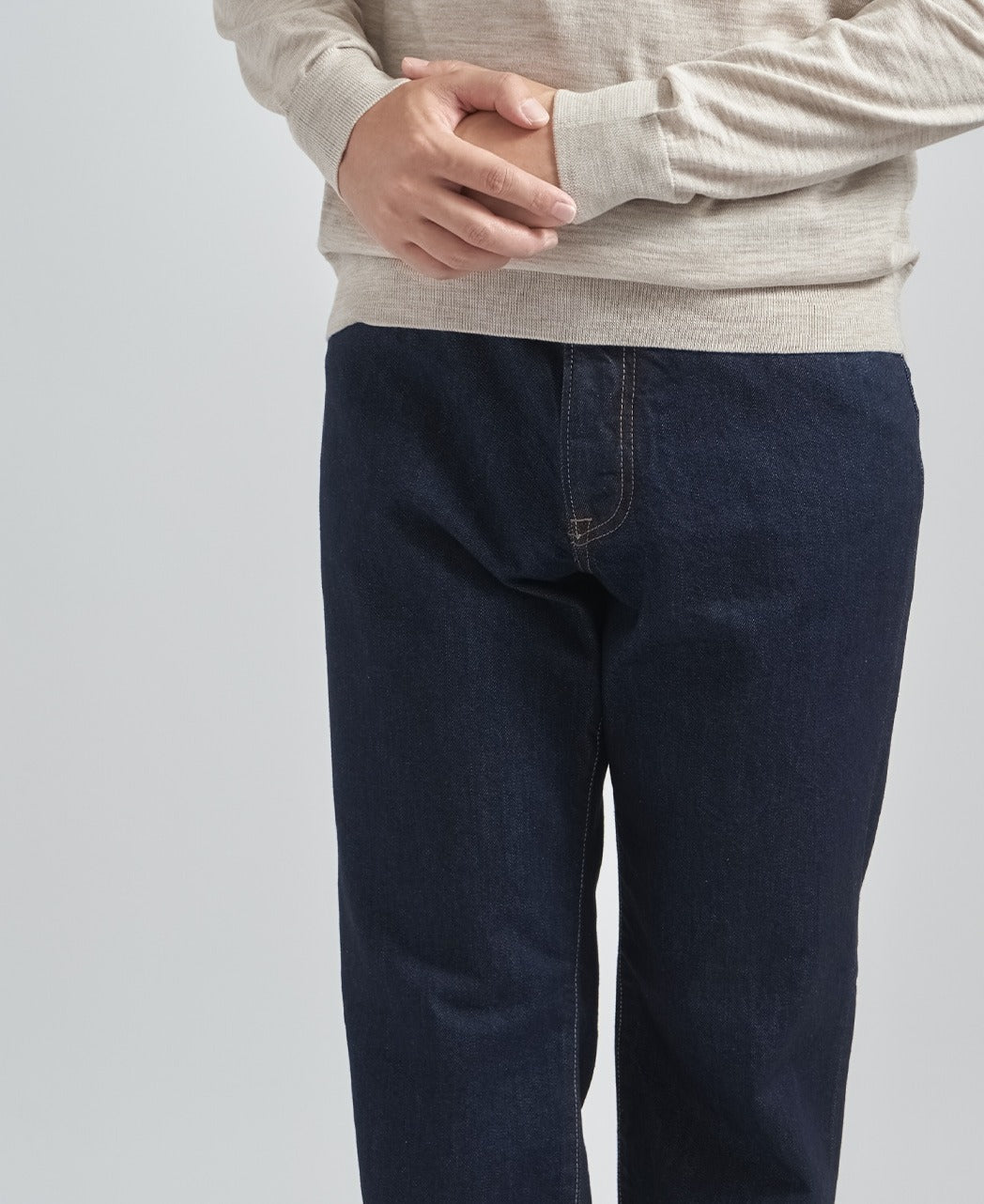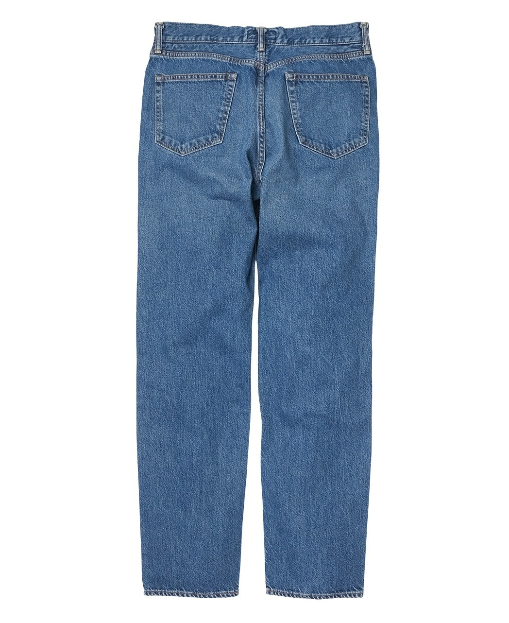 Designed with a slightly deeper rise and a gentle taper from the knee to the hem, the silhouette is carefully calculated to create a clean, elongated leg line. By omitting stitching on the hip pockets and the leather patch, and unifying the details with silver buttons and rivets, the design achieves a minimalist and refined aesthetic.